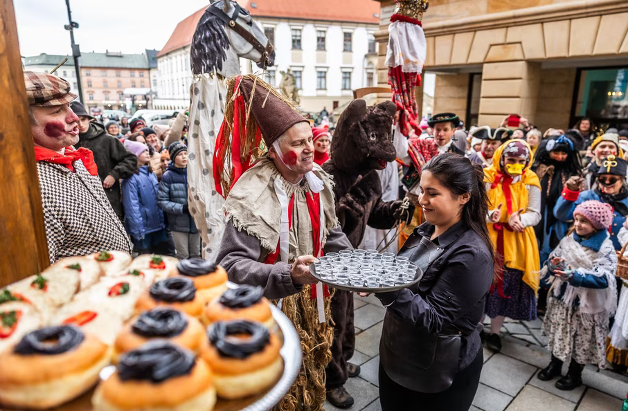 Těšit se můžete třeba na cimbálovou muziku, Hanácký mužský sbor Rovina či pěvecký soubor Bobule. Chybět samozřejmě nebude tradiční ukázka řeznické práce a zabijačky. Tentokrát se o ni postará Hanácký Grunt z Unčovic. Zabijačkové a masopustní speciality nabídnou na svém stánku také Restaurace Poděbrady, bistro Na Návse ze Skrbně a Havlíčkovo řeznictví. Na jarmarku s regionálními produkty seženete sladké koláče, karamel, med, perníky i sýry, uzeninu či koření.