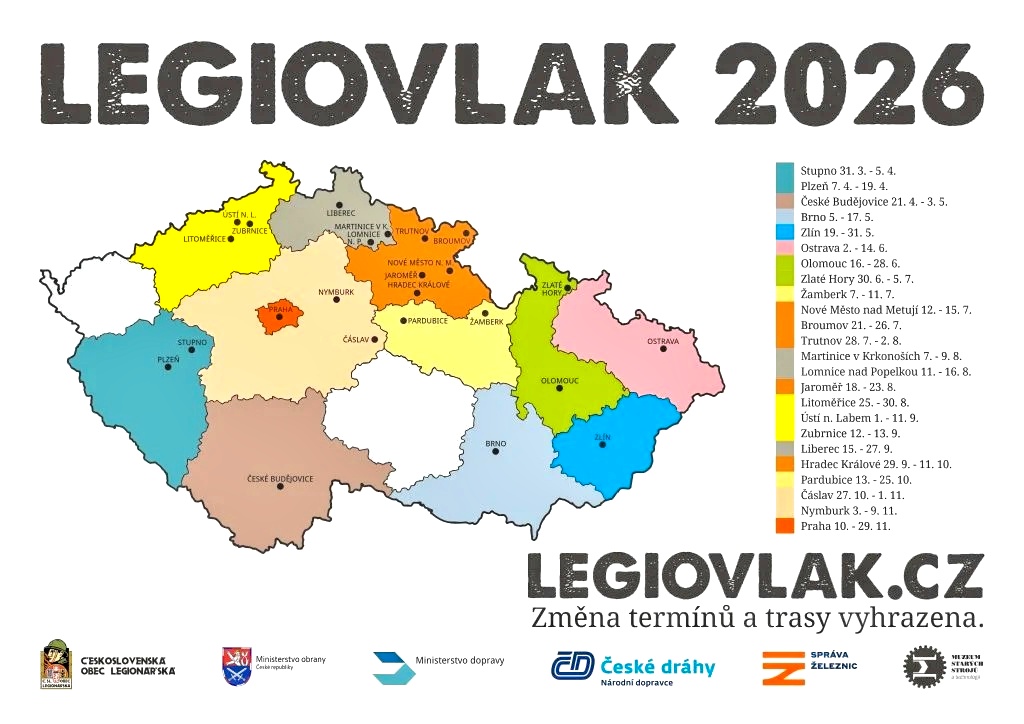 Dalšími zastávkami Legiovlaku budou Plzeň (7.–19. dubna) a České Budějovice (21. dubna–3. května 2026). Celkem připravila Československá obec legionářská ve spolupráci s partnery, mezi nimiž je i Správa železnic, trasu zahrnující 24 zastávek po celé republice. Legiovlak vyjíždí už po třinácté.